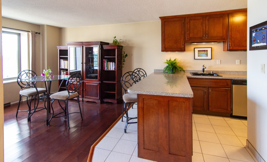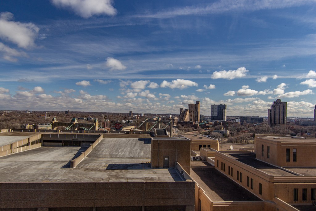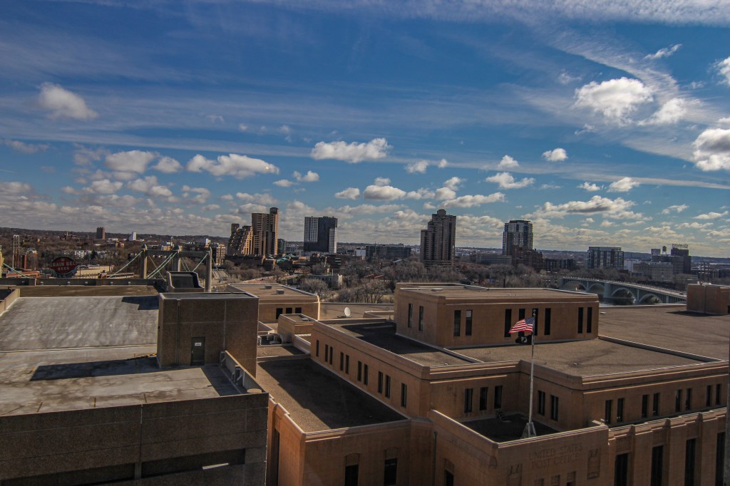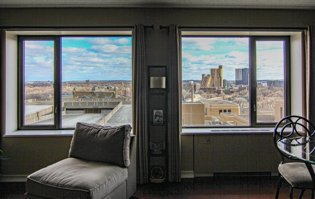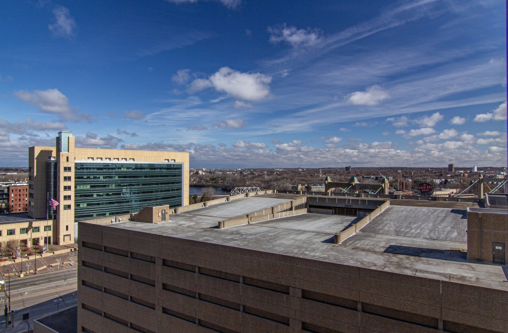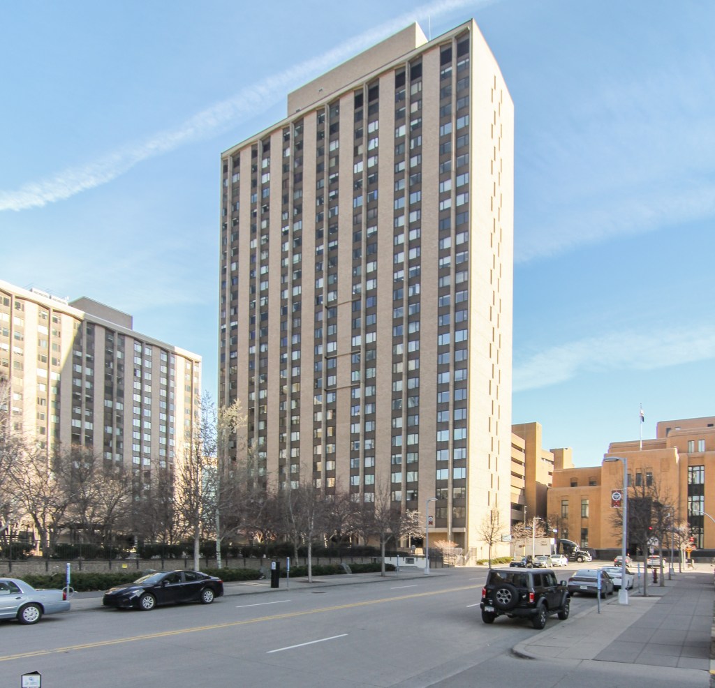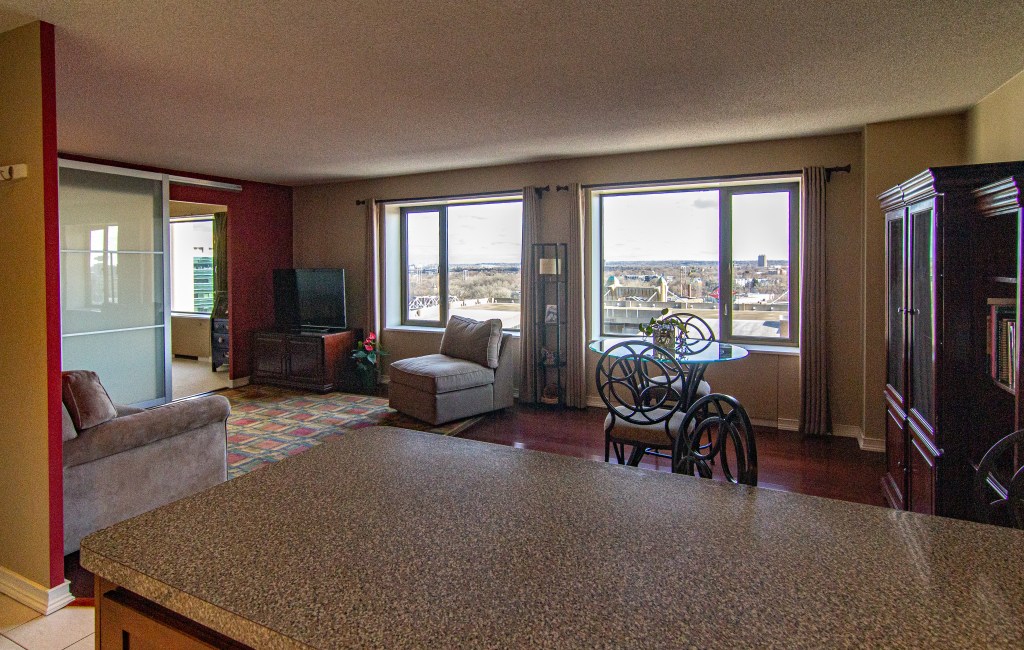 Panoramic views from this one-bedroom 14th floor condo in building B of The Towers! Located just above the neighboring US Post Office, this unit has some river views toward the NW and SE. Many features and updates include: Remodeled kitchen with newer cabinetry, countertops, stainless appliances, and a breakfast bar. Beautifully updated bathroom. Great closet space. Open floor plan and modified to offer more bedroom closet space, a linen cabinet outside the bathroom, and a sliding door between the living room and the bedroom. Move-in condition! The $717.71/month association fee includes $35.45 for cable and $20.00 for internet service. Numerous building amenities – Largest green space courtyard in all of Downtown. Pool / Tennis Courts / Gardens / Patios. Two work-out facilities. Sauna. Business Center / Library. Party Room w/kitchen for catering. On-site management. Guest Suites available to rent. Parking available based on a wait list at $75/month outdoor and $120/month indoor. Indoor guest parking available for a fee. Small storage locker included. River view units in this building B of The Towers on even-numbered units only.