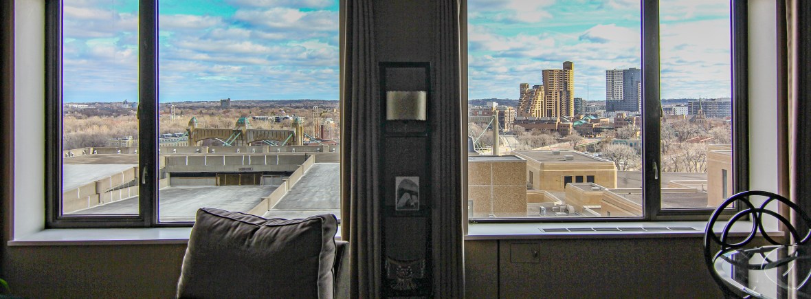 Panoramic views from this one-bedroom 14th floor condo in building B of The Towers! Located just above the neighboring US Post Office, this unit has some river views toward the NW and SE. Many features and updates include: Remodeled kitchen with newer cabinetry, countertops, stainless appliances, and a breakfast bar. Beautifully updated bathroom. Great closet space. Open floor plan and modified to offer more bedroom closet space, a linen cabinet outside the bathroom, and a sliding door between the living room and the bedroom. Move-in condition! The $717.71/month association fee includes $35.45 for cable and $20.00 for internet service. Numerous building amenities – Largest green space courtyard in all of Downtown. Pool / Tennis Courts / Gardens / Patios. Two work-out facilities. Sauna. Business Center / Library. Party Room w/kitchen for catering. On-site management. Guest Suites available to rent. Parking available based on a wait list at $75/month outdoor and $120/month indoor. Indoor guest parking available for a fee. Small storage locker included. River view units in this building B of The Towers on even-numbered units only.