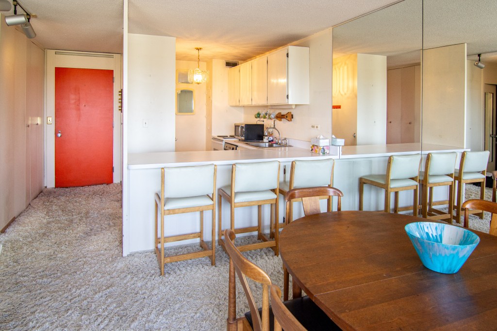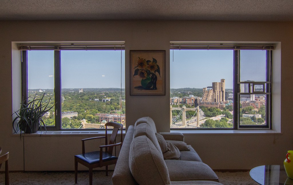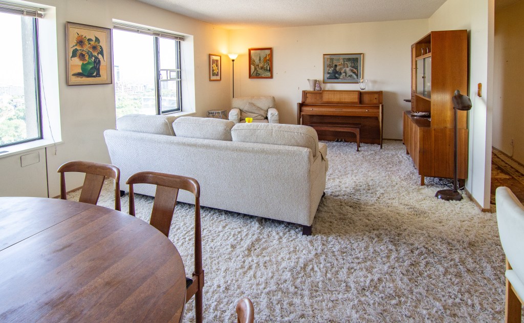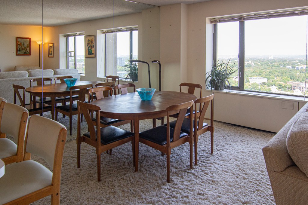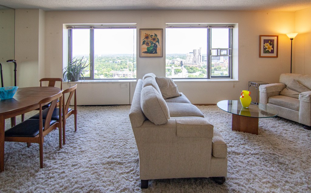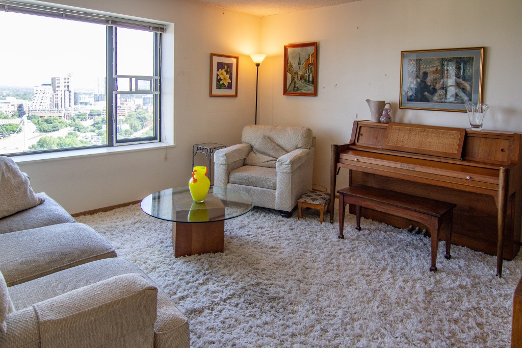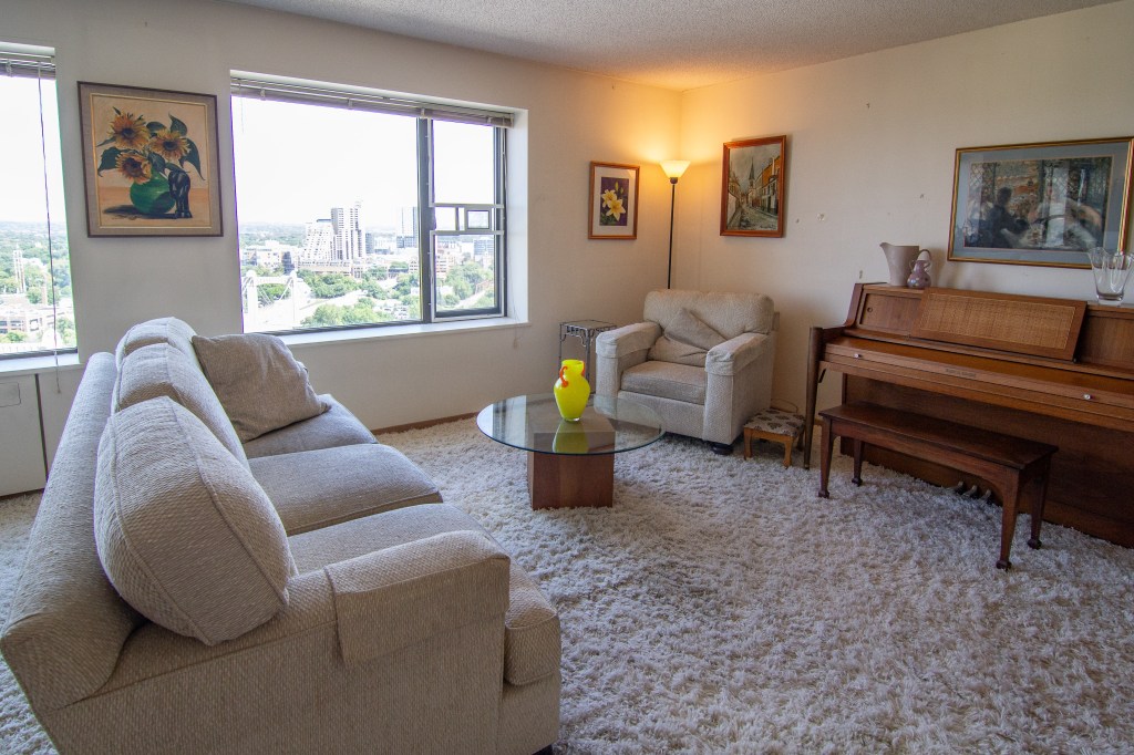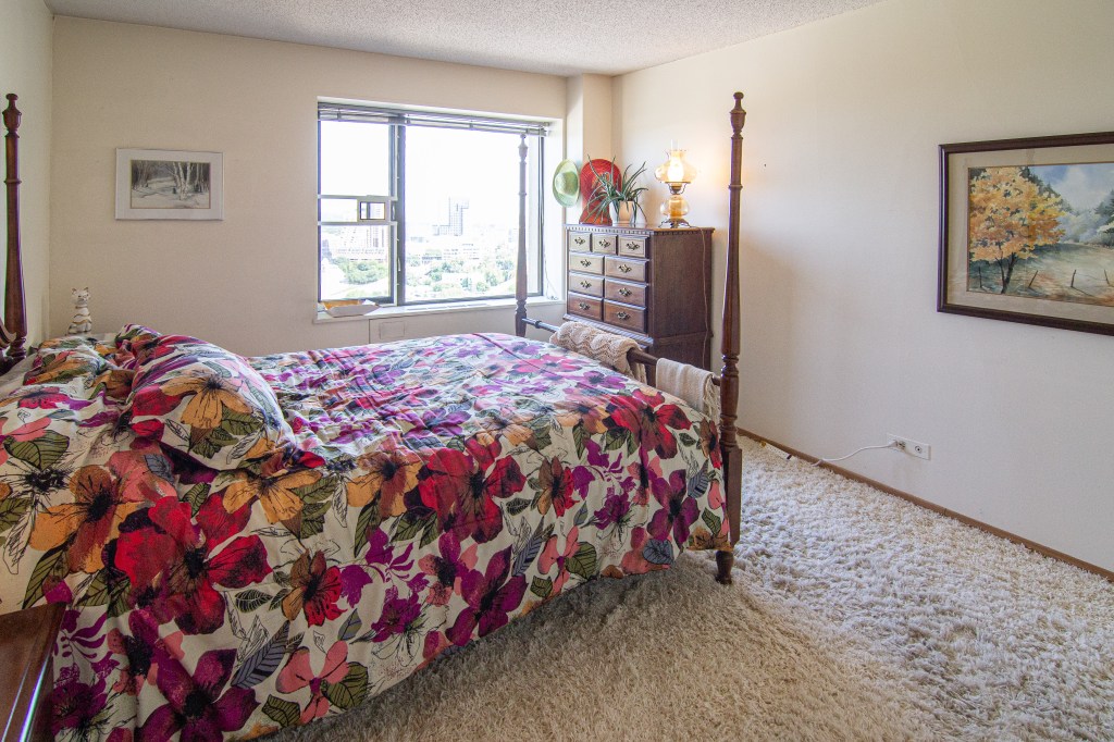 Incredible views from this 22nd floor condo in building B of The Towers! Long term ownership and the first time available for sale in 39 years provides you with an excellent opportunity to update and design this one to your own tastes. Great floor plan. Association fee of $682/month includes $33.41 for cable and $24.64 for internet service. Numerous building amenities – Largest green space courtyard in all of Downtown with Pool / Tennis Courts / Gardens / Patios. Two work-out facilities. Sauna. Business Center / Library. Party Room w/kitchen for catering. On-site management. Guest Suites available to rent. Parking available based on a wait list at $70/month outdoor and $110/month indoor. Indoor guest parking available for a fee. Small storage locker included. River view units in this building B of The Towers begin around the 18th floor on even-numbered units only.